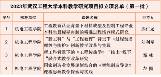 (通讯员 马琳伟)2023年11月7日,学校教务处发布了2023年武汉工程大学本科教学研究项目(第一批)立项通知,我院共计4项教研项目获批进入立项准备阶段。