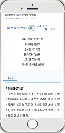 科普月期间,学院依托官方微信公众号打造“科创赋能”线上平台,发布原创推文《学科竞赛50问·启蒙篇》及配套《学科竞赛手册》。内容涵盖竞赛价值认知、导师联系渠道、团队组建策略等10大模块,针对大一新生关切的“零基础参赛”“选题方向选择”等问题提供实操指南,手册同步收录全国大学生机械创新设计大赛等12类赛事的备赛周期、核心要求及校内资源对接方式,形成“线上自主学习+线下导师答疑”的资源联动模式。