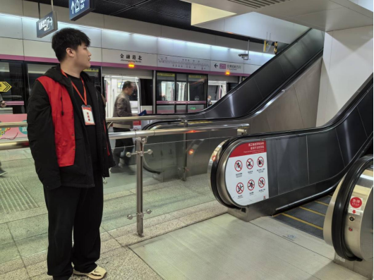 在地铁服务站点,机电学子身着志愿服装,坚守在各个站口扶梯站外平台等关键区域,用耐心、细心与责任心为往来乘客提供全方位服务。站外平台他们仔细拾捡散落在地上的垃圾,不放过任何边角站口扶梯处他们紧盯乘客动态,时刻准备上前提供帮助。从清晨到日暮,“红齿轮”志愿者们始终坚守岗位、恪尽职守,用微笑传递温度,用行动诠释担当。
