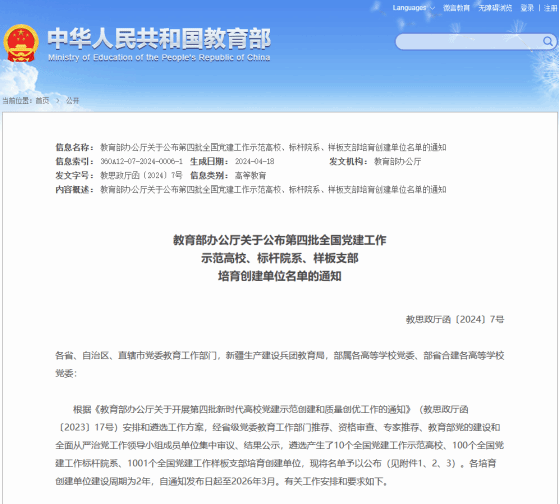 截至目前,学院共获批培育创建“全国党建工作样板支部”2个、首批全省党建工作“样板支部”1个、全省“先进基层党支部”1个、校“研究生样板党支部”(重点培育创建单位)1个,学院党委获评首批全省党建工作“标杆院系”。