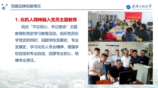 化机教工党支部于2021年被评为湖北省高等学校先进基层党组织,成功获批第二批全国党建工作样板支部培育创建单位并通过验收,2024年入选全国高校“双带头人”教师党支部书记“强国行”专项行动团队。该党支部现有党员16名,其中国家级人才2人,包括“教育部有关人才计划”1人,省部级荣誉称号获得者5人。杨红教授自2019年担任化机教工党支部书记,全程主导组织了样板党支部的培育创建工作并顺利获批,个人先后获评武汉工程大学“十佳师德标兵”“十佳班主任”“教学十佳”等,并被推荐为2020年湖北省“十佳师德标兵”候选人。