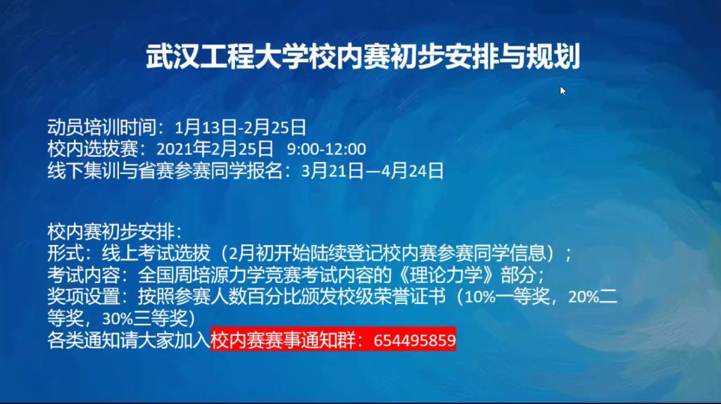 (通讯员沈晓希)1月31号下午,武汉工程大学周培源力学大赛校内选拔宣讲会成功举办。本次会议中,华中科技大学老师郑慧明与我校老师马志敏、张聪为工大学子讲解大赛概况、培训计划及校内赛安排等广受关注的内容,百余名工大学子到会并积极参与。