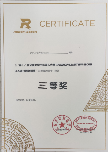 本网讯(通讯员张聪 张靖宇)由江苏省计算机学会主办,江苏省教育厅为指导单位,中国矿业大学、深圳市大疆创新科技有限公司协办的2019年RoboMaster(机甲大师)机器人校际联盟(含邀请)赛正式落下帷幕。我校机器人代表队(Nautilus战队)经过三天的激烈角逐,从众多参赛队伍中脱颖而出,进入16强,并取得了三等奖的优异成绩。