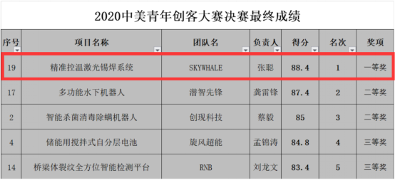 (通讯员张聪)7月14日由中华人民共和国教育部主办的大赛“第七届中美青年创客大赛”武汉赛区总决赛落下帷幕。我校科技创新团队“SKYWHALE团队”的“精准控温激光锡焊系统”项目在武汉赛区总决赛中以第一名的优秀成绩进入全国赛。