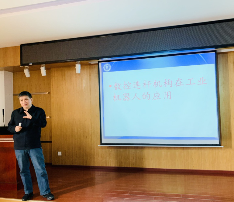 讲座中,蔡教授以如何做好工业机器人的驱动电机及其减速机为切入点,分析了国内外工业机器人相关研究中存在的问题和需要突破的难点,通过点焊机器人这一具体案例来说明当前我国焊接机器人最大的问题是振动影响焊接质量,机器人的电机、减速器必须做得小和轻,他指出机械臂要以复合材料代替金属材料来减轻其质量。蔡教授讲述了多自由度数控连杆机构的研究历史,展示了他所在的研究团队的多项研究成果,并着重介绍了其团队研制的新型多自由度可控机构式装载机。它具有以往机械式和液压式装载机的共同优点,而克服其各自的缺点。既克服以往机械式装载机动作简单,速度等难控制等不足,又克服液压装载机液压元件要求高、易产生漏油、可靠度难保证等不足。