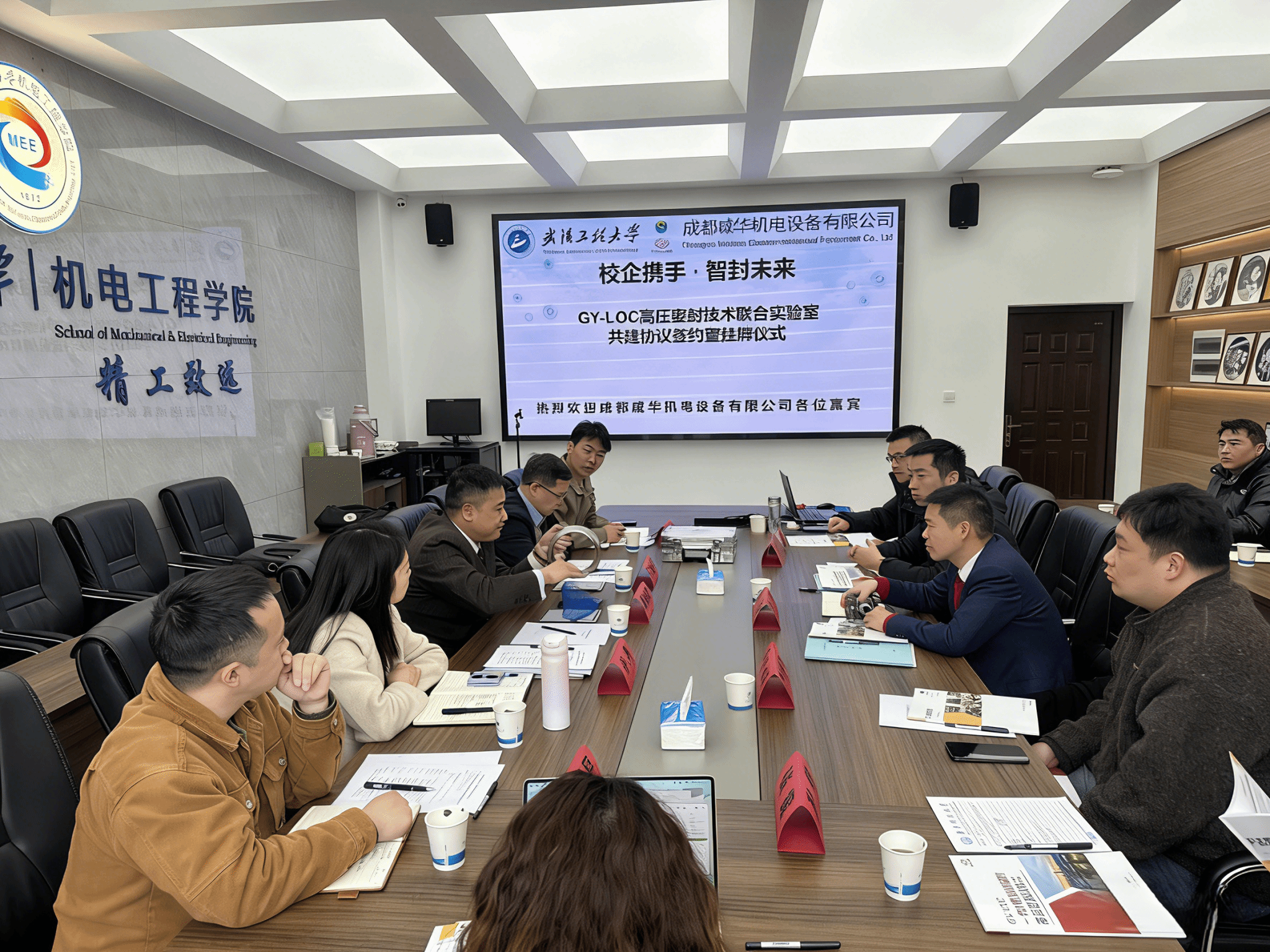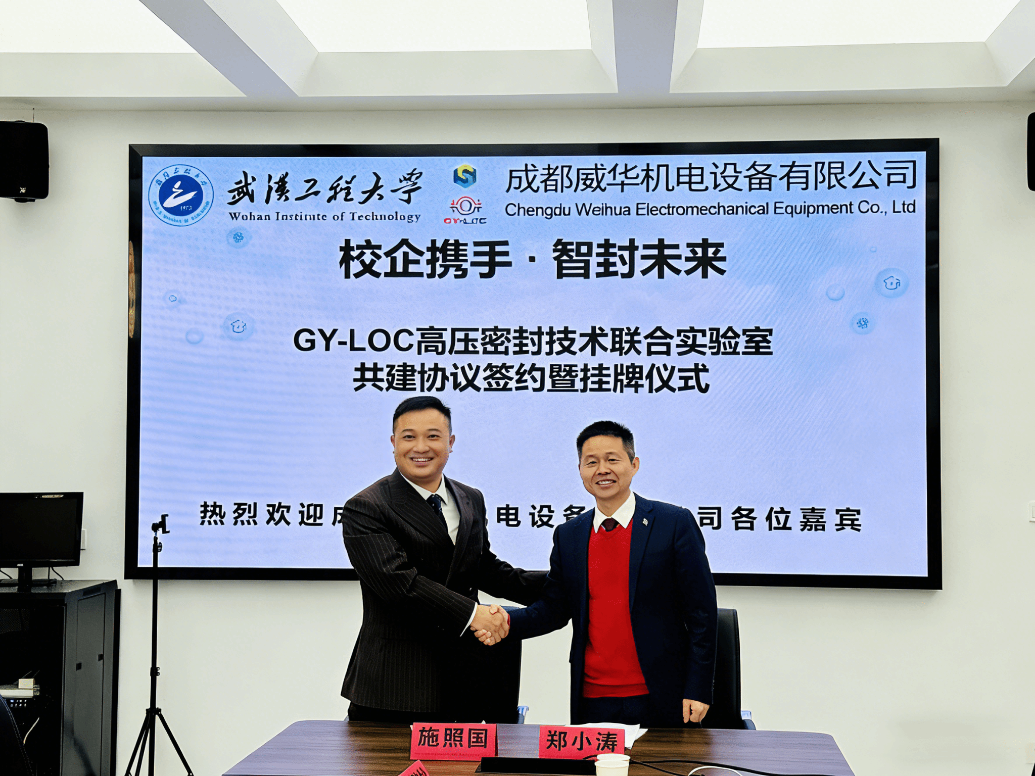 交流会后,双方举行了共建协议签约仪式。成都威华机电设备有限公司施照国与武汉工程大学太阳集团2138院长郑小涛代表双方签署合作协议,并为“GY-LOC智能高压密封技术联合实验室”揭牌。根据协议,双方将共建联合实验室,聚焦智能高压密封技术前沿,推动行业发展,计划三年内确定 2-3 个核心研究课题,联合培养5-8名高层次技术人才,力争形成智能高压密封新技术2~3项。