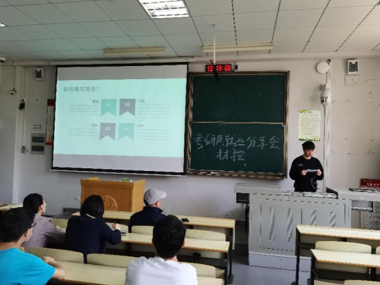 随后,即将入职上汽通用武汉分公司的2018级赖瑶同学进行了求职方面的经验分享。他从简历制作、笔试和面试环节注意事项、公司选择等方面进行了详细讲解。