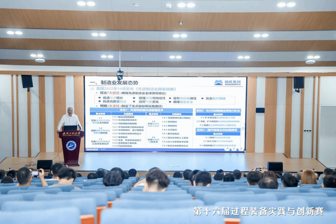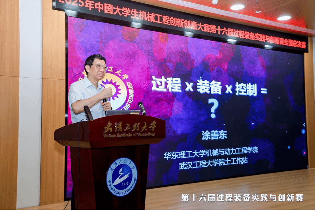 赛事进程中,武汉工程大学举办了“数智赋能过程装备及创新人才培养”学术论坛,邀请中国工程院院士陈学东、涂善东作特邀报告,共同探讨数智时代过程装备的前沿技术、产业实践及未来趋势,共同探索工程创新人才产学研协同育人模式。陈学东院士作《我国制造业发展态势与未来五年重大科技突破方向》专题报告,从制造业发展态势、战新未来产业发展现状、相关领域“十五五”重大科技突破方向三方面展开,结合全球各国制造业的发展趋势及最新战略部署,梳理相关领域未来重点突破方向,为我国制造业高质量发展提出前瞻性思路与建议。涂善东院士作《过程X装备X控制=无尽的前沿》专题报告,以“无尽的前沿”“无边界的科学”“面向全过程的专业教育”等关键词为报告脉络,解读过程装备与控制工程的专业定位和发展方向,号召专家学者携手努力,以“无边界”创新催生技术群体性突破,推动过程装备与控制工程的稳定发展。