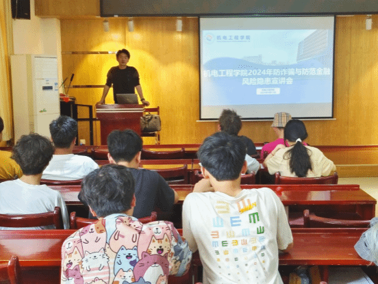 通讯员 万浩天)为进一步做好本年度防范化解金融风险工作,切实维护学校师生安全,建设文明校园,4月14日下午,在机电学院205会议室为学生开展了一场“筑牢金融反诈防线”主题教育宣讲会,学院辅导员万浩天、2023级新生代表参加此次活动。宣讲会由2023级辅导员杨星主持。