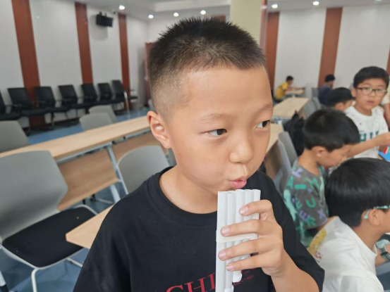 “原来科学也能‘演奏’音乐!”活动现场,孩子们在志愿者的指导下,通过裁剪、排列和固定吸管,用不同长度的吸管制作出简易排箫。孩子们发现长吸管吹奏时音调低沉,短吸管则发出高亢的声音。志愿者解释道:“吸管内的空气柱长度决定了振动频率,频率越高,音调越尖锐。”随着孩子们尝试吹奏简单的旋律,原本抽象的物理知识转化为跃动的音符。