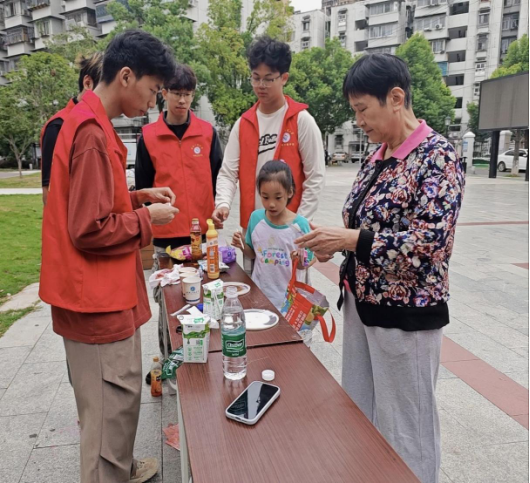 在社区广场上,志愿者们携带实验器材支起“科学小课堂”。桌上摆满色素、牛奶、烧杯等材料,“梦幻彩虹雨”“水母烟花”“沸腾的彩虹奶”等实验道具整齐排列,吸引了众多小朋友驻足围观。孩子们围在桌前,眼神中充满期待,不时向志愿者提问:“这个颜色真的会像彩虹一样吗?”“我能自己试试搅拌吗?”现场热闹又有序,科学探索的氛围悄然升温。