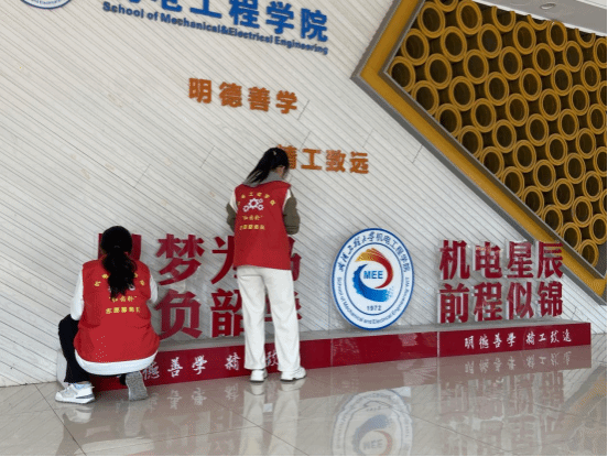 在机电学院办公室和实验室中,志愿者们擦拭门窗、清洁信息栏、归置物品,为营造良好的学习环境辛勤奉献。