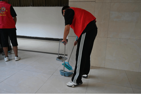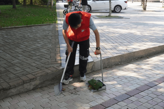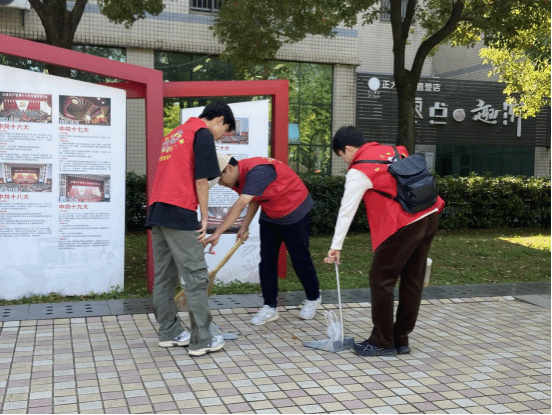 在微特钟楼思源广场上,志愿者们热情洋溢、干劲十足,清扫垃圾、清除落叶、捡拾杂物、清理展板,精准务实的完成清洁工作。