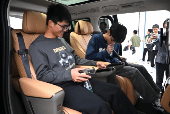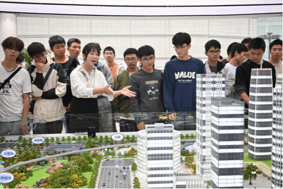 参观过程中,讲解员结合展厅内陈列的机械模型详细介绍了比亚迪在汽车、电池、轨道等方面的创新,结合比亚迪现有的新能源车型及电子展板展示了云辇车身控制系统、“易四方”系统、e平台3.0与DM-i超级混动等新能源汽车技术品牌。在讲解员的带领下,同学们在比亚迪武汉品牌体验中心了解企业发展历史、主营业务、汽车行业发展趋势等有关知识,在有趣、新奇的互动体验中感受比亚迪“技术为王,创新为本”的品牌文化基因,感受科技创新给汽车行业带来的勃勃生机。