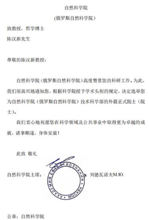 我校陈汉新教授当选俄罗斯自然科学院外籍院士