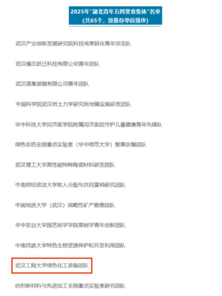 (通讯员 徐博文)4月30日,2025年“湖北青年五四奖章集体”评选结果揭晓,我校绿色化工装备团队获此殊荣。