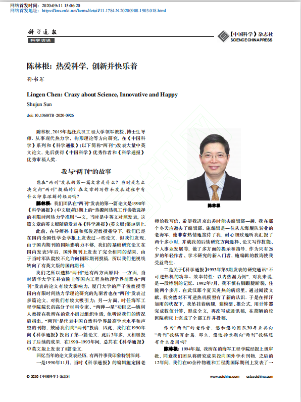 2020926日《中国科学》杂志社《科学通报》以《陈林根:热爱科学,创新并快乐着》为题,刊发了对陈教授的专访。陈教授在专访中讲述了与“两刊”的故事,阐述了自己对“两刊”的角色、定位和发展趋势的理解和认识,回顾了“两刊”的过去,并寄语“两刊”未来。