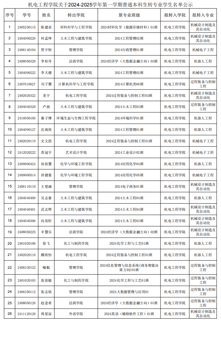 根据《武汉工程大学普通本科生转专业实施办法》(武工大教发﹝2022﹞4号)文件规定和学校本科生院《关于做好2024-2025学年第一学期普通本科生转专业工作的通知》的有关要求,经学院领导小组对申报材料的审查以及申请人的综合考核,拟同意符合相关文件及通知精神的26名学生的转专业申请。现将名单予以公示(按姓氏拼音排序),公示期为2024年12月14日-2023年12月20日,如有异议,请于2024年12月20日中午12点前向学院学生工作办公室反映,联系电话:87992016。