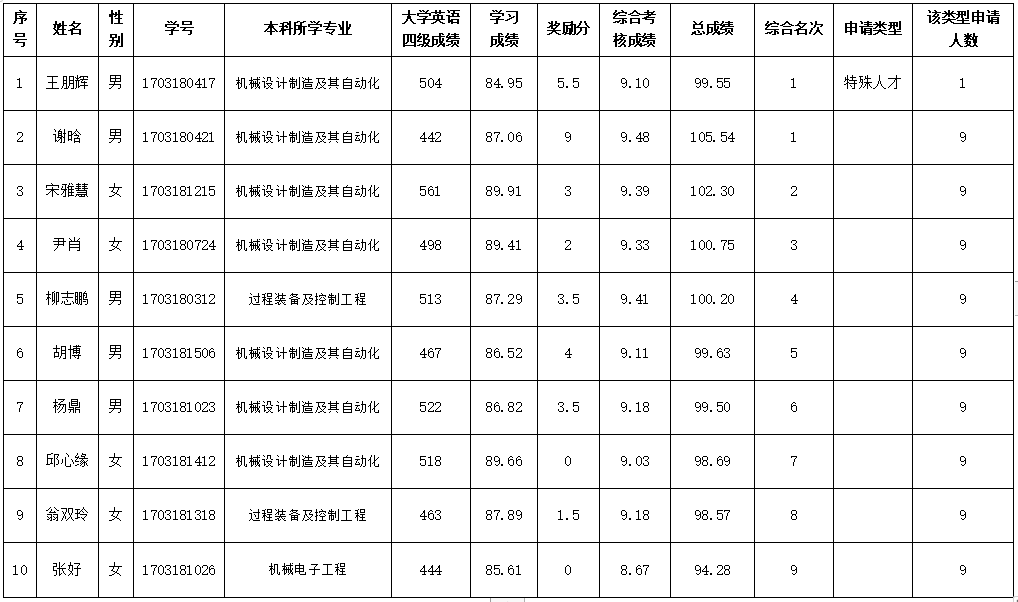 根据武汉工程大学关于推荐优秀应届本科毕业生免试攻读硕士学位研究生管理办法(试行)》(校研〔2017〕20号)等文件精神和要求以及研究生院《武汉工程大学2021年推荐优秀应届本科毕业生免试攻读硕士学位研究生工作实施方案》要求,按照《武汉工程大学太阳集团2138关于开展推荐2021届优秀应届本科毕业生免试攻读硕士学位研究生工作的实施细则》,经学生自主申报,学院根据实施细则反复测算学习成绩和奖励分,认真审核学生申请材料,学院推免生遴选工作小组打分、评审专家评审,汇总各项分数,现将评审结果(共10人)按排名公示如下:
