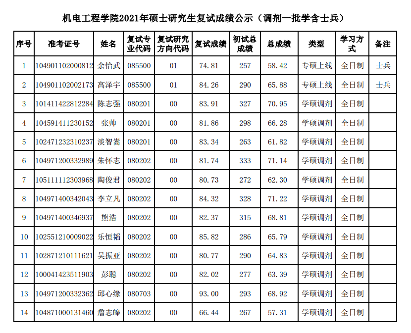 太阳集团21382021年硕士研究生复试成绩公示(调剂一批学含士兵)