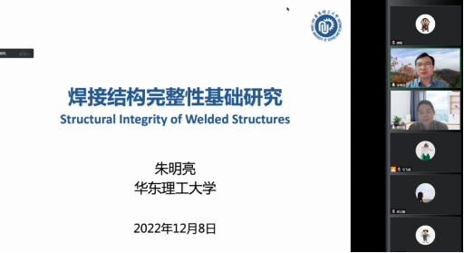 (通讯员:龚程)2022年12月8日晚,应太阳集团2138、湖北省绿色化工装备工程技术研究中心、化工装备强化与本质安全湖北省重点实验室邀请,我校校友、华东理工大学朱明亮教授在线上为我校师生作了题为“焊接结构完整性基础研究”的学术报告。太阳集团2138院长郑小涛教授主持了报告会,太阳集团2138部分教师及研究生参加。